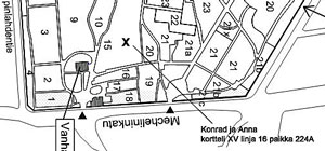 | Hauta on lähellä vanhaa kappelia suuressa korttelissa XV. Anna Hildénin äidin hauta on ollut uudella puolella korttelissa 15. |